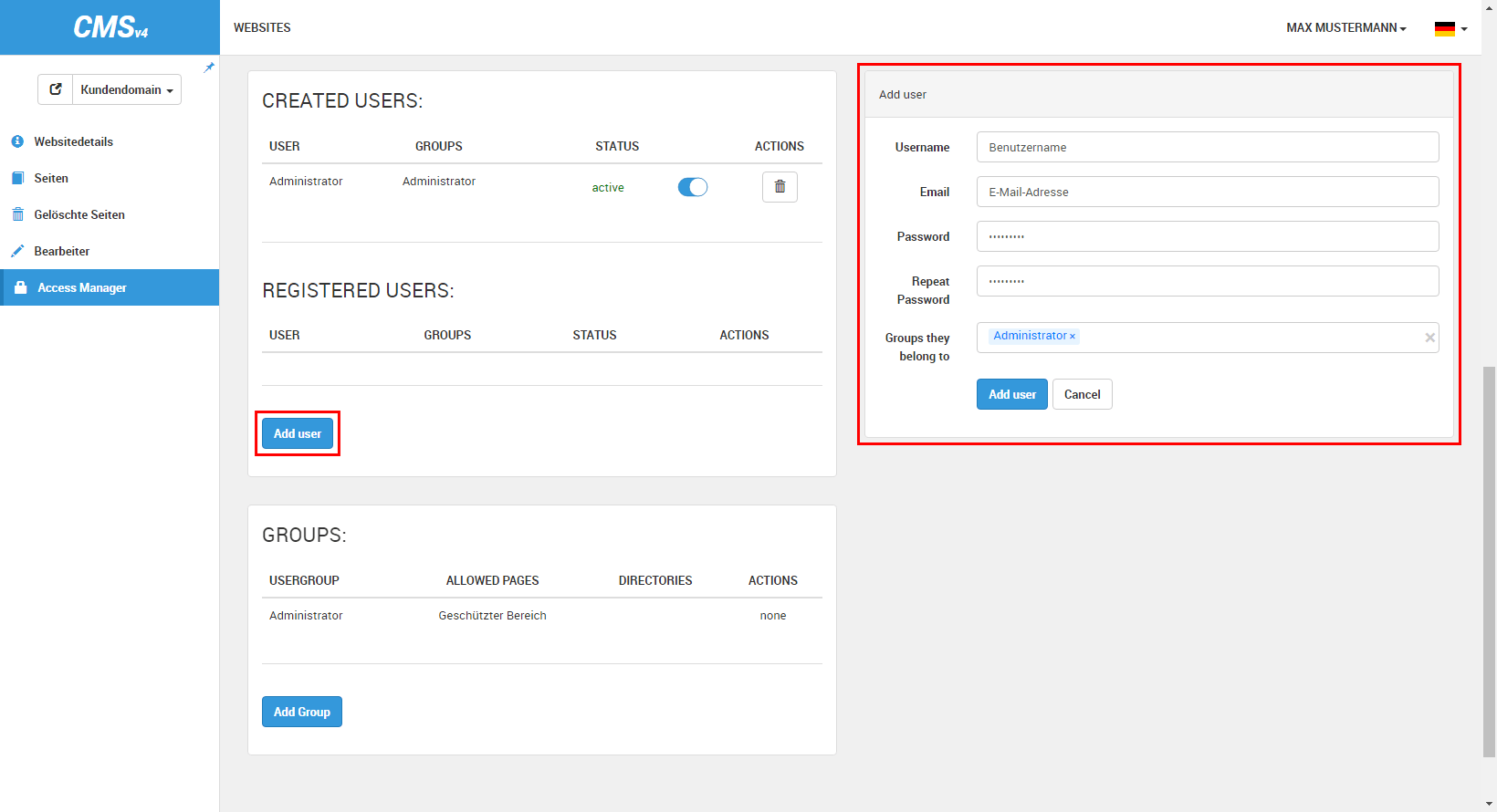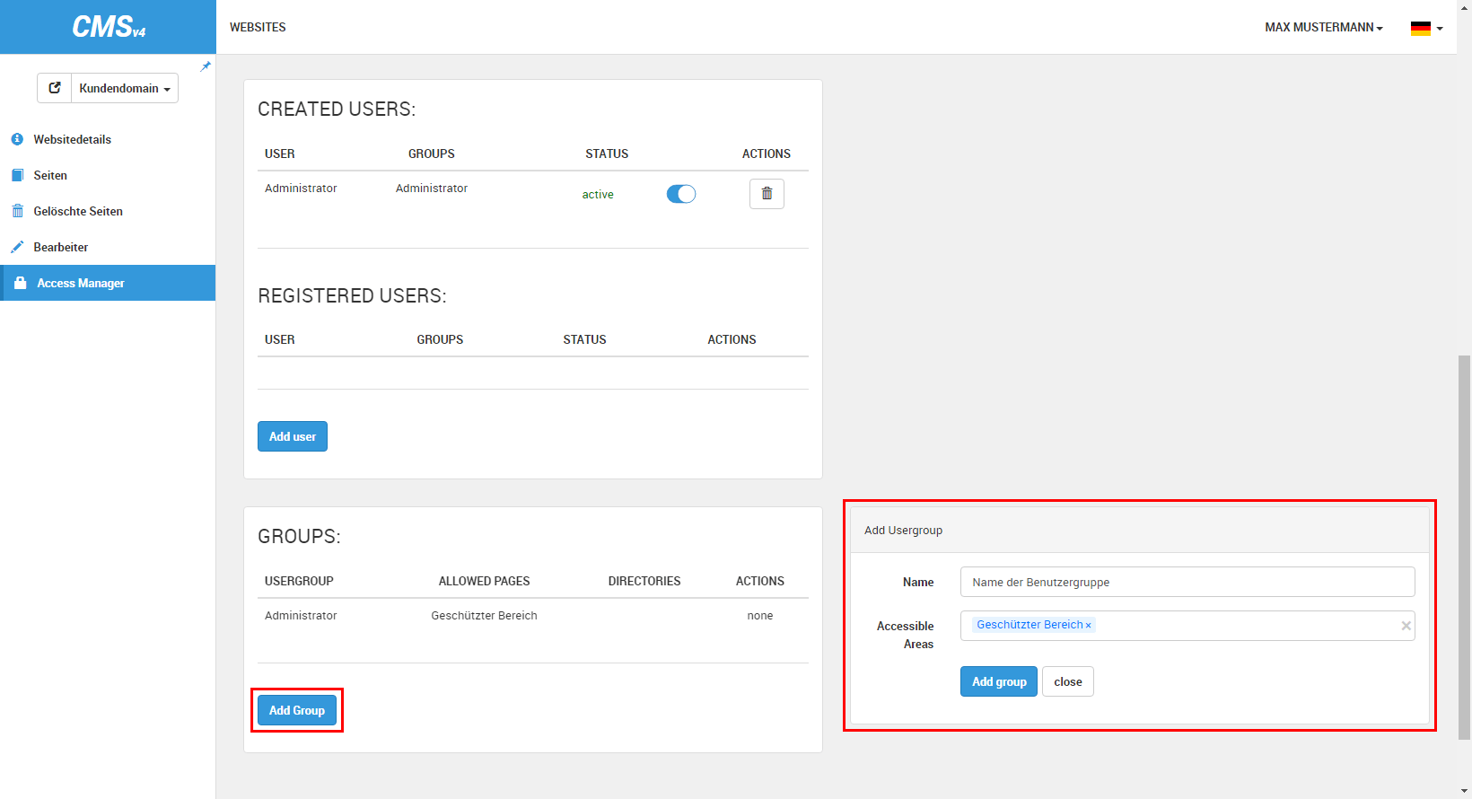 Auf der linken Seite lässt sich nun der Menüpunkt »Access Manager« finden. Sofern dieser Bereich freigegeben und aktiviert wurde, erhalten Sie jetzt einen Überblick über Ihre geschützten Seiten »Protected Areas«, Ihre Benutzer »Created Users« und Ihre Benutzergruppen »Groups«. An dieser Stelle haben Sie nun auch die Möglichkeit, Benutzer anzulegen und diese in Benutzergruppen zusammenzufassen.