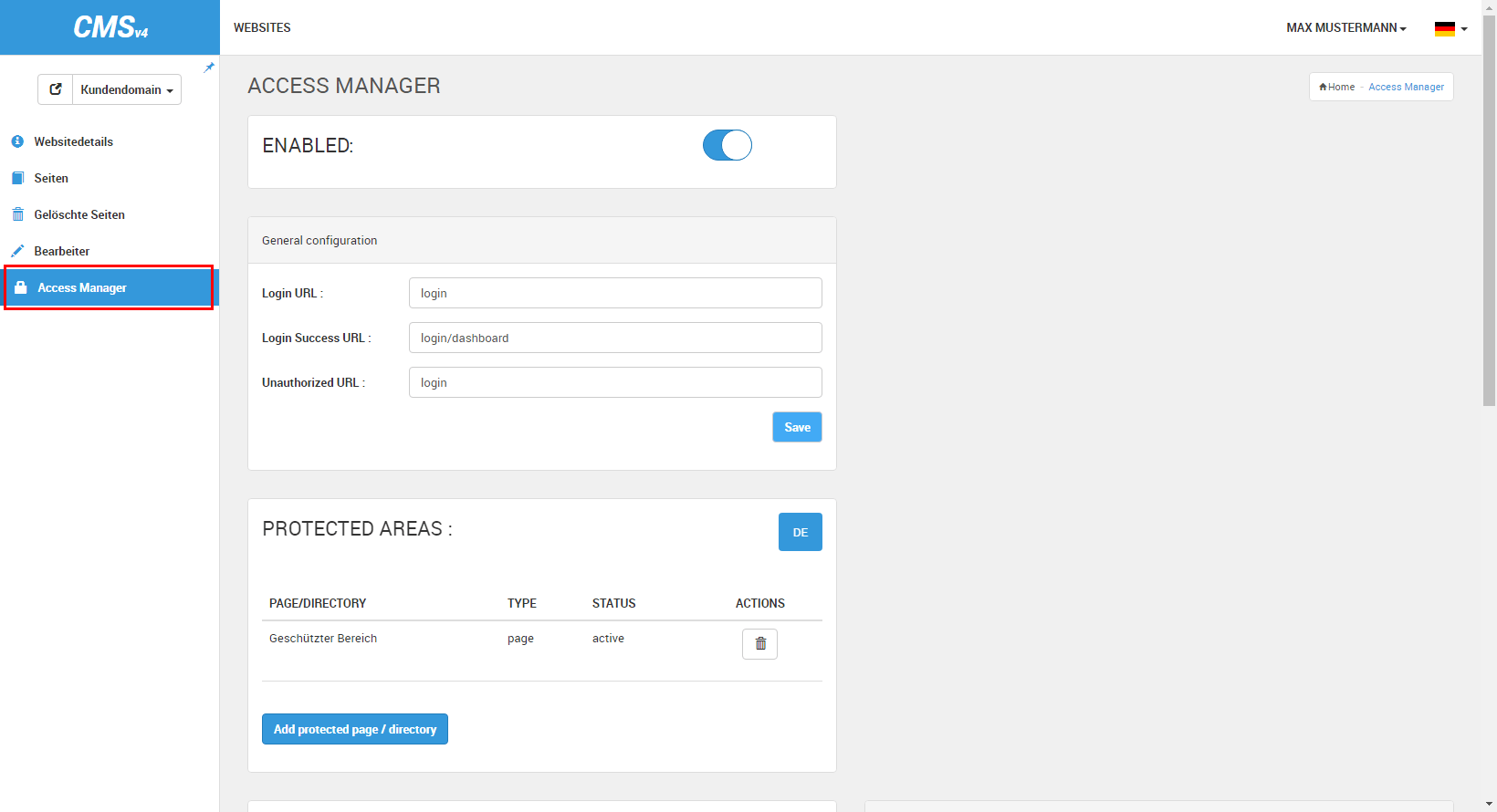 - Wechseln Sie zum Menüpunkt »Access Manager« und fügen Sie die neu erstellte Seite dem Verzeichnis »Protected Areas« über den Button »Add protected page / directory« hinzu. Dies stellt sicher, dass die Seite nur für berechtigte Benutzer sichtbar ist.
