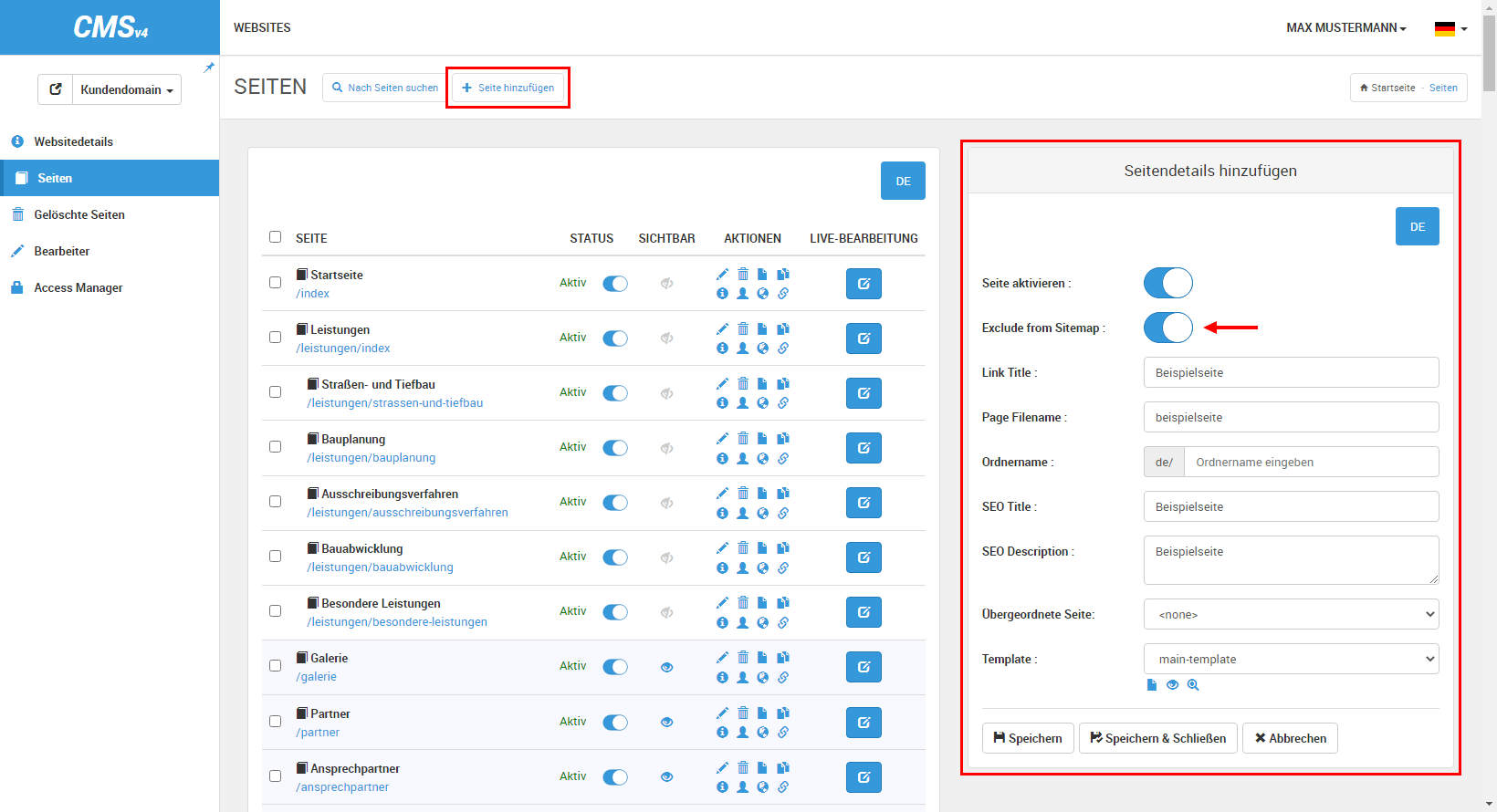 - Klicken Sie auf den Button »Seite hinzufügen« neben der Überschrift.