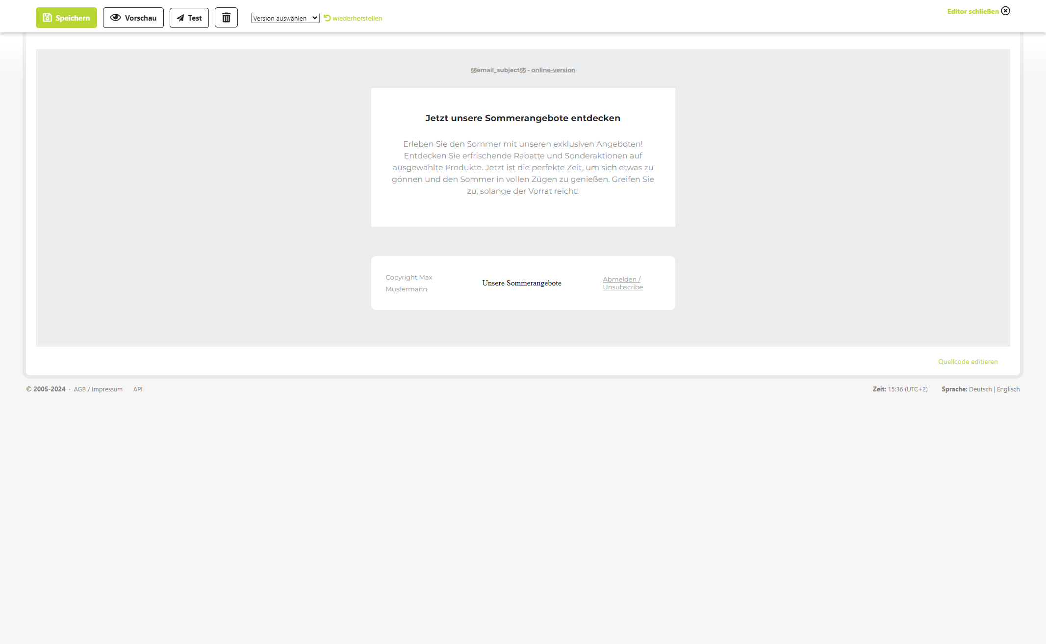 Für eine Vorabansicht des Newsletters können Sie auf das Auge-Symbol oben rechts klicken. Dies zeigt Ihnen, wie der Newsletter für Ihre Empfänger aussehen wird, sodass Sie letzte Feinabstimmungen vornehmen können.