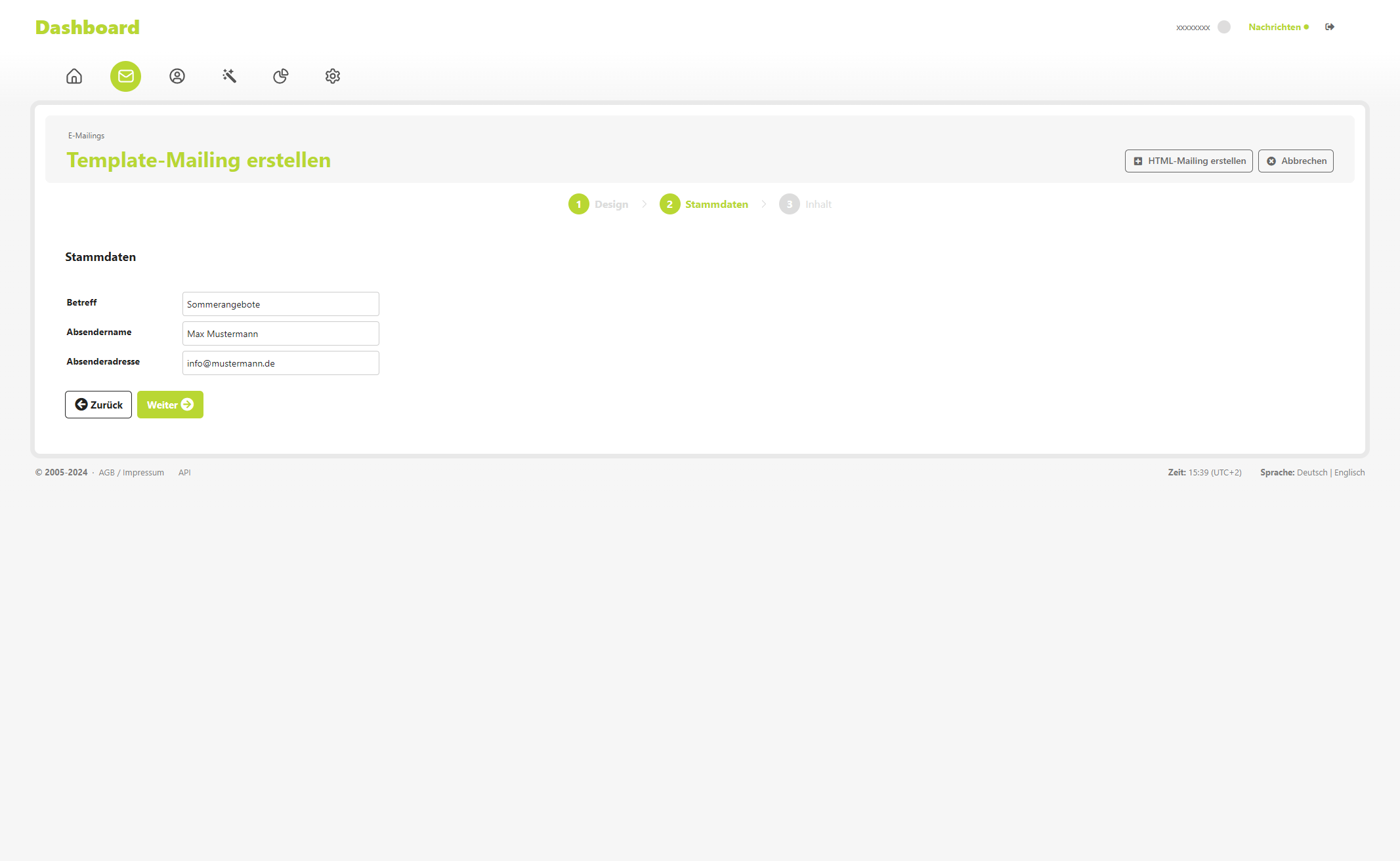 Beim Angeben der Stammdaten für Ihren Newsletter tragen Sie die grundlegenden Informationen ein, die in jeder E-Mail erscheinen sollen. Dazu gehören in der Regel der Absendername, die Absender-E-Mail-Adresse und gegebenenfalls eine Antwortadresse. Diese Daten sind wichtig, um den Empfängern klar zu machen, wer der Absender ist und wie sie bei Bedarf antworten können. Achten Sie darauf, dass diese Angaben korrekt und professionell sind, da sie den ersten Eindruck Ihres Unternehmens vermitteln.