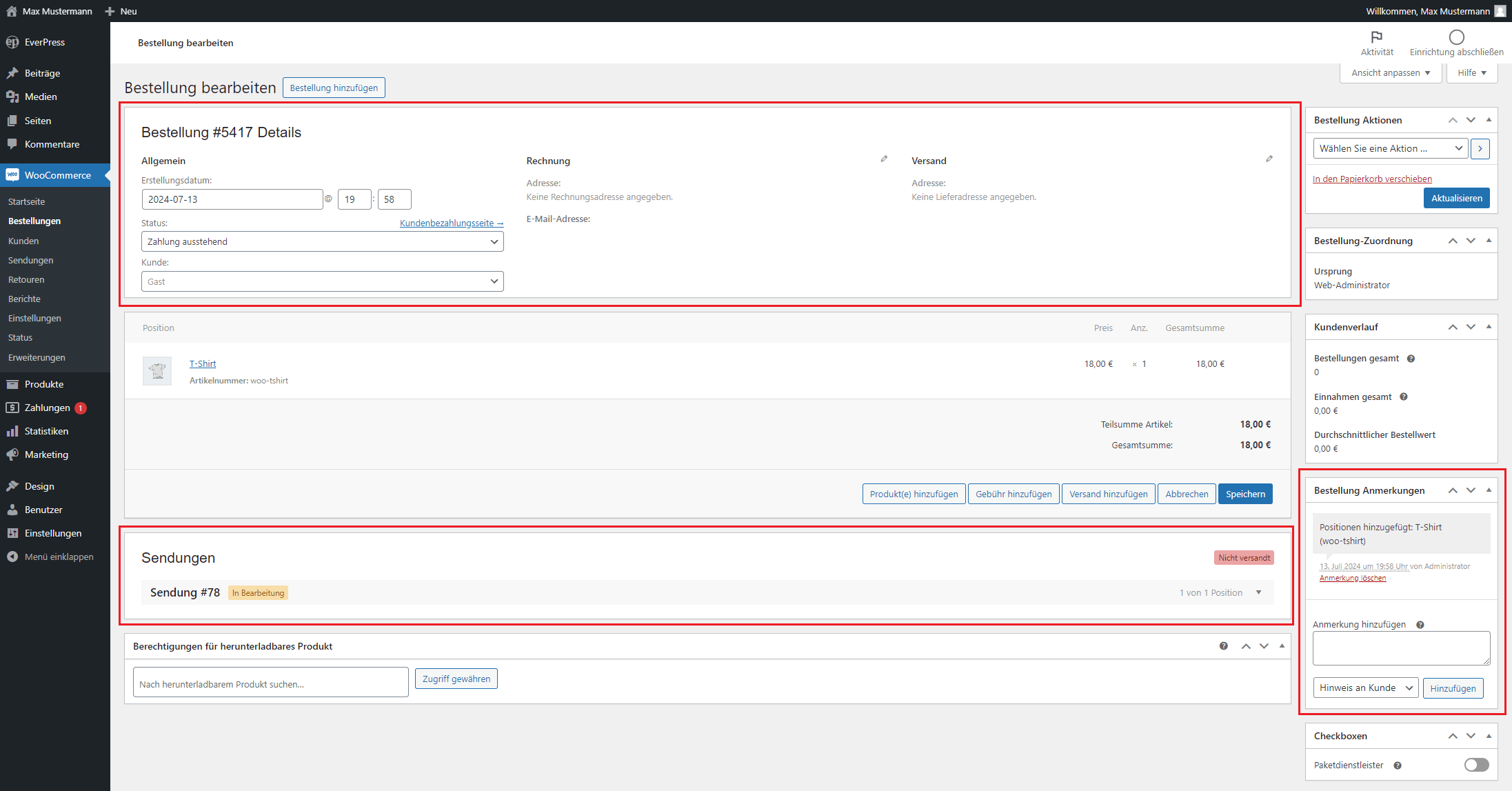 - Erweitert: Hier können Sie spezifische Verkaufsnotizen hinzufügen, die der Kunde nach dem Kauf sieht, oder spezielle Bestellhinweise eingeben.