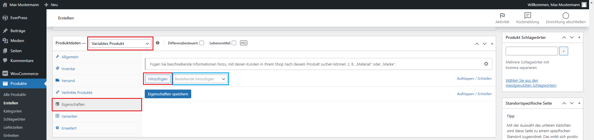 Gehen Sie zum Reiter „Eigenschaften“. Klicken Sie auf „Hinzufügen“, um eine neue Eigenschaft hinzuzufügen und geben Sie der Eigenschaft einen Namen, wie „Größe“ oder „Farbe“. Per Klick auf „Bestehende hinzufügen“ lassen sich bereits angelegte Eigenschaften auswählen.