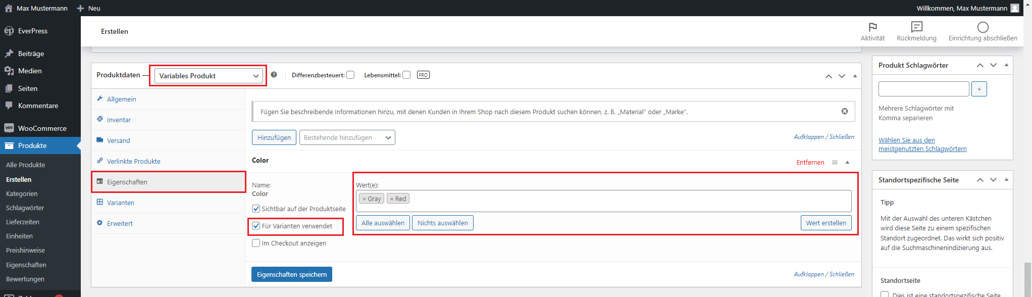 Aktivieren Sie das Kontrollkästchen „Für Varianten verwenden“, um diese Eigenschaft für die Erstellung von Varianten zu nutzen. Klicken Sie anschließend auf „Eigenschaften speichern“.