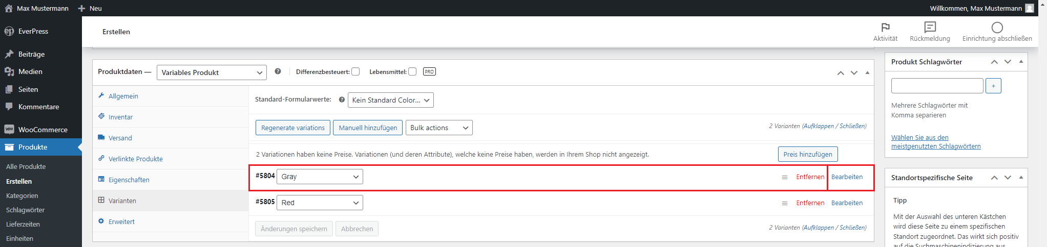 Aktivieren Sie diese Option „Lagerverwaltung“ um den Lagerbestand zu verfolgen. Sie können den Lagerbestand für jede Variante separat verwalten.
