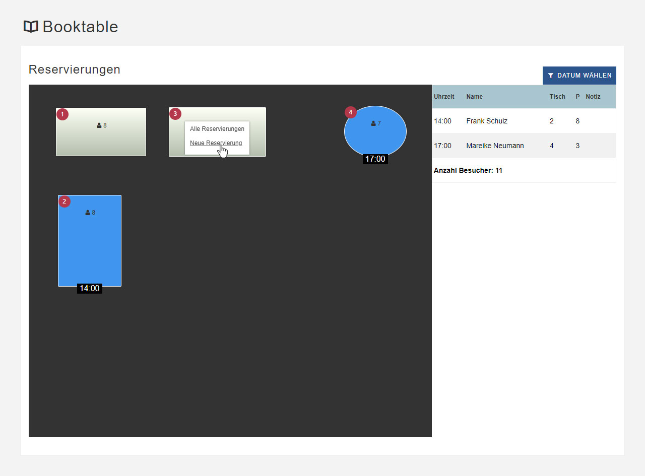 Hier sehen Sie auf einen Blick, welche Tische aktuell nicht belegt sind. Sie können das Datum und die Uhrzeit bestimmen und eine Mindestanzahl an verfügbaren Sitzplätzen vorgeben, um die Ausgabe zu filtern.
